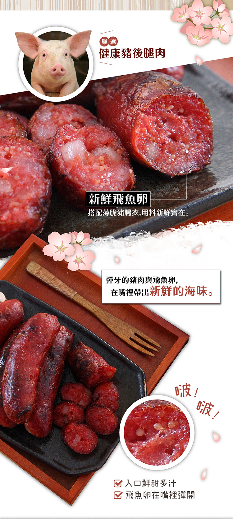 成份:飛魚卵、豬肉、豬腸衣、魚蛋白加水分解物、乳糖、砂糖、食鹽、酵母抽出物、核酸調味料、油桂粉、麥芽糊精、水解大豆蛋白、醬油、牛脂、牛肉抽出物、洋蔥、葡萄糖、木糖、紅麴色粉、調味劑、甜味劑、抗氧化劑、保色劑(亞硝酸鈉)、粘稠劑、品質改良劑、香料