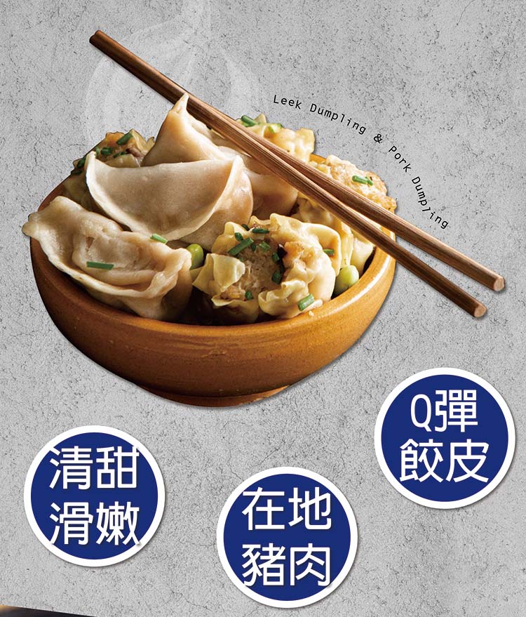 成分: 麵粉、高麗菜、豬肉(台灣)、水、韭菜、大豆沙拉油、薑、釀造醬油、糖、鹽、大豆蛋白(非基因改造)、胡椒粉