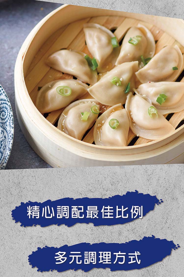 成分: 麵粉、豬肉(台灣)、高麗菜、韭菜、水、大豆沙拉油、大豆蛋白(非基因改造)、薑、釀造醬油、糖、鹽、胡椒粉