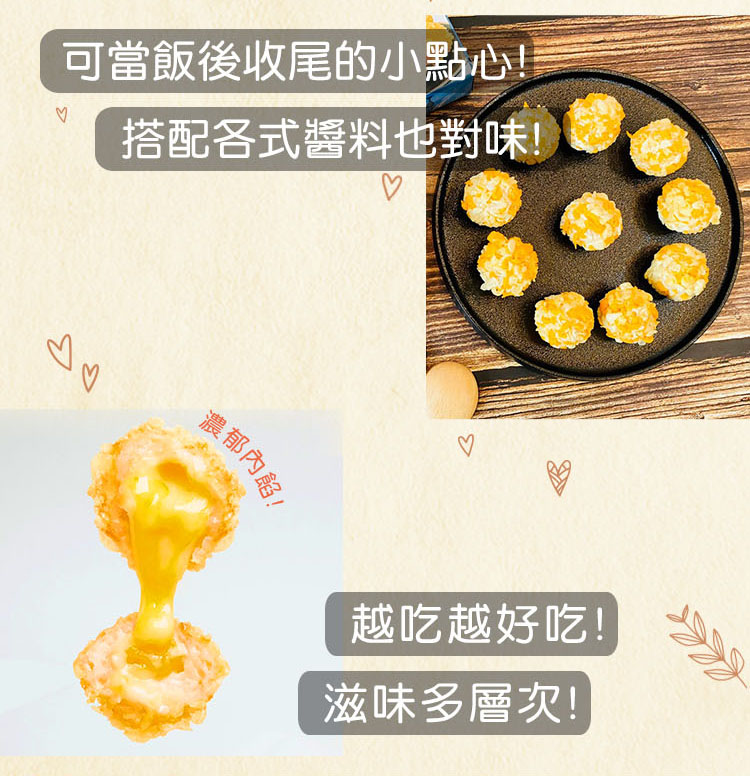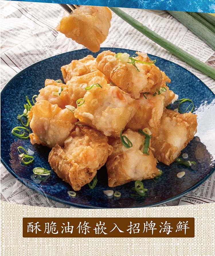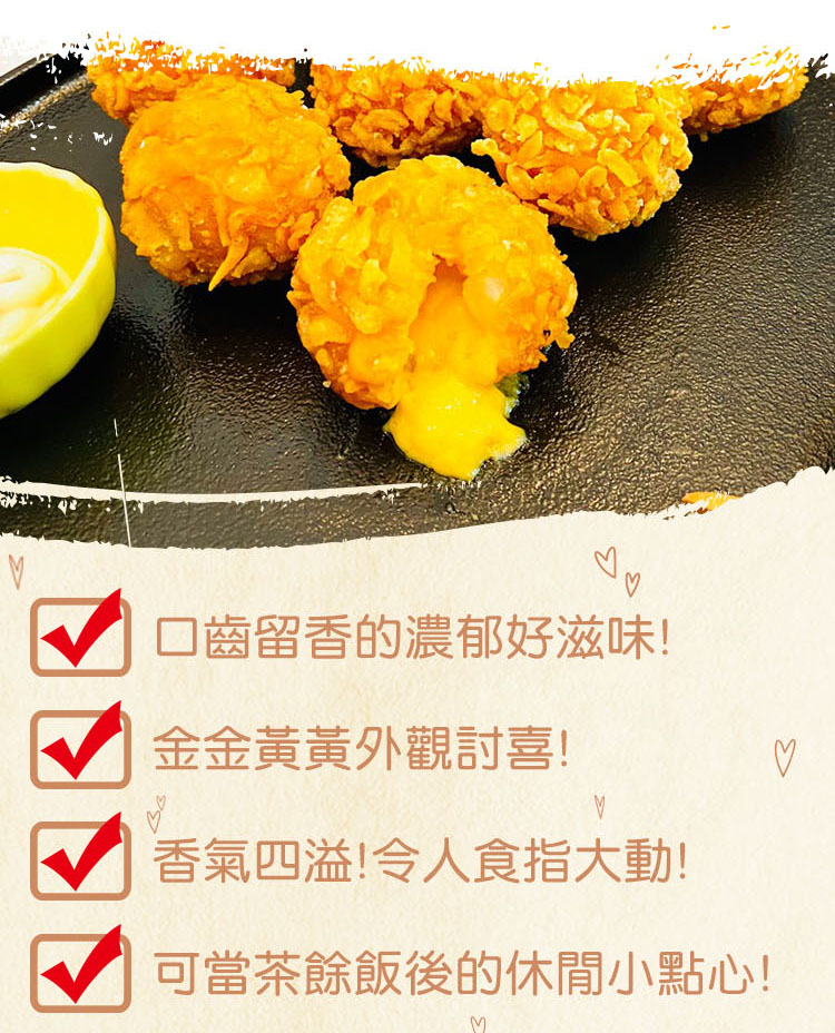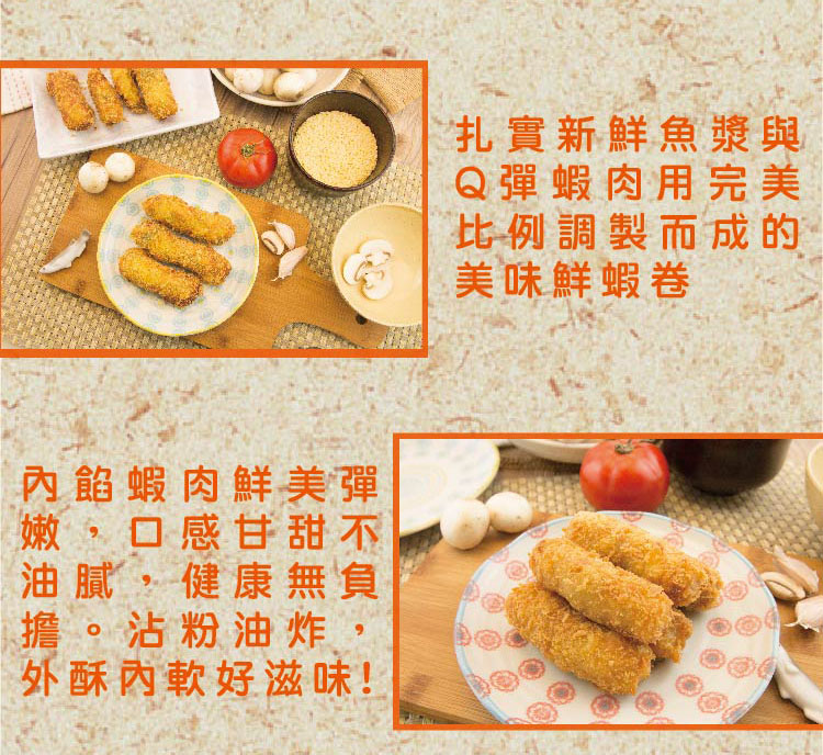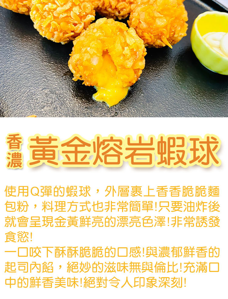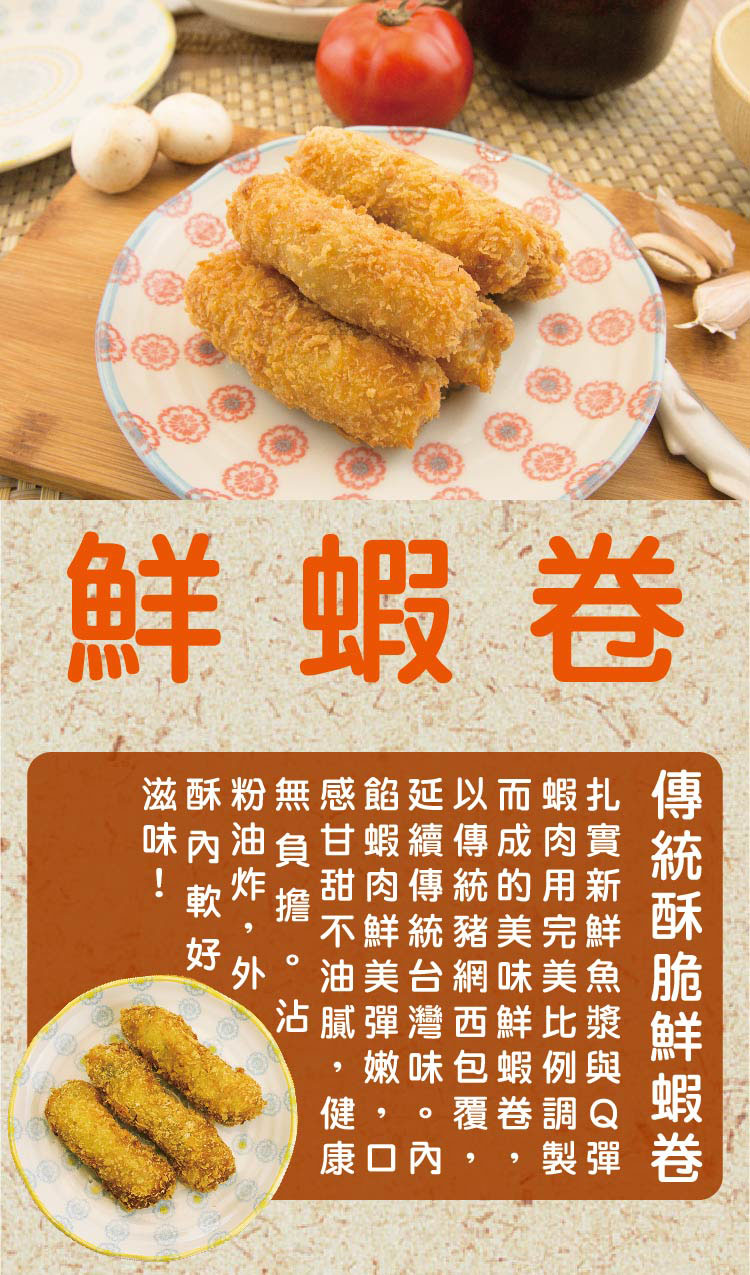 成分:白蝦仁、金線魚漿、天婦羅粉[小麥麵粉、玉米澱粉、鹽、泡打粉(小蘇打、酒石酸氫鉀、玉米粉)、棕櫚油、乳化劑(脂肪酸甘油脂) 、食用色素(梔子)、起司、鹹蛋黃、奶油、玉米澱粉、胡椒粉、白砂糖、鹽