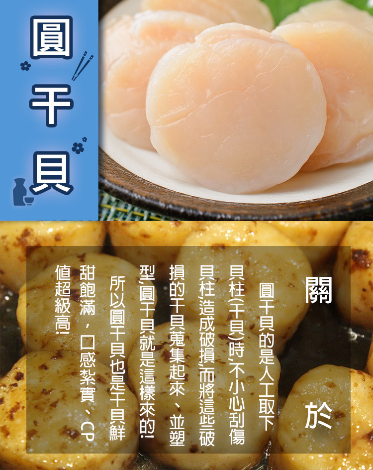 圓干貝是由人工取下貝柱(干貝)時,不小心刮傷造成破損,將這些破損的干貝蒐集起來、再塑型!圓干貝就是這樣來的!