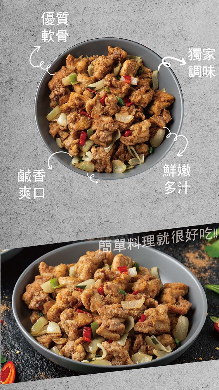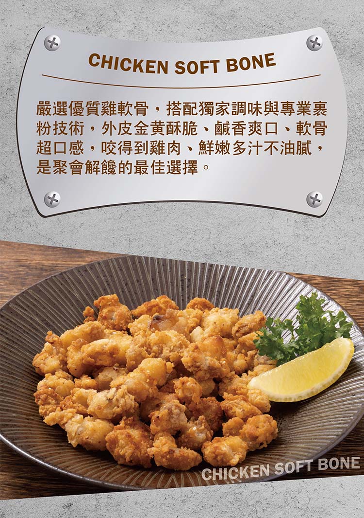 成分: 雞軟骨、樹薯澱粉、馬鈴薯澱粉、麵粉、玉米澱粉(非基改)、醬油、鹽、糖、味精、胡椒、蒜、辣椒、辣椒精、燒肉醬(醬油粉、棕櫚油、大豆油、豬肉蛋白粉(瑞典)、大蒜精油、D-山梨醇液70%(甜味劑)、脂肪酸蔗糖脂、脂肪酸甘油酯、香料、玉米糖膠)、多磷酸鈉、焦磷酸鈉、偏磷酸鉀、胺基乙酸、DL-胺基丙酸、5'-鳥嘌呤核苷磷酸二鈉、小蘇打、關華豆膠、甜味劑(蔗糖素、甘草酸胺)、肉精香料