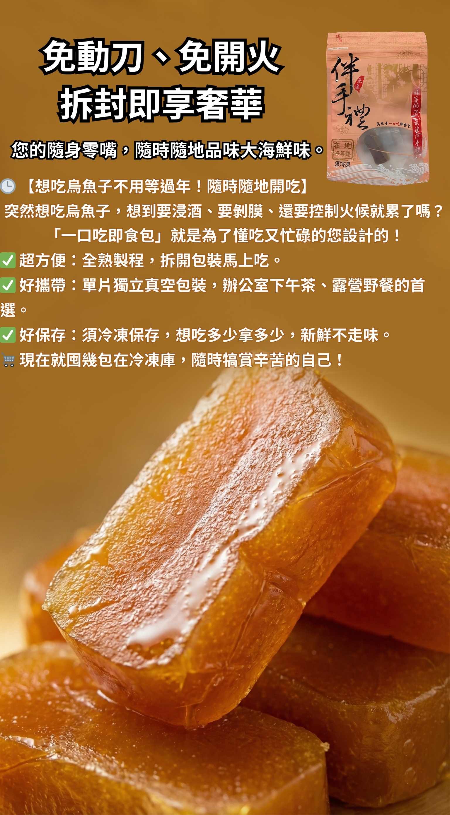 -精選烏魚子製成一口尺寸,方便食用、口感扎實不黏牙。