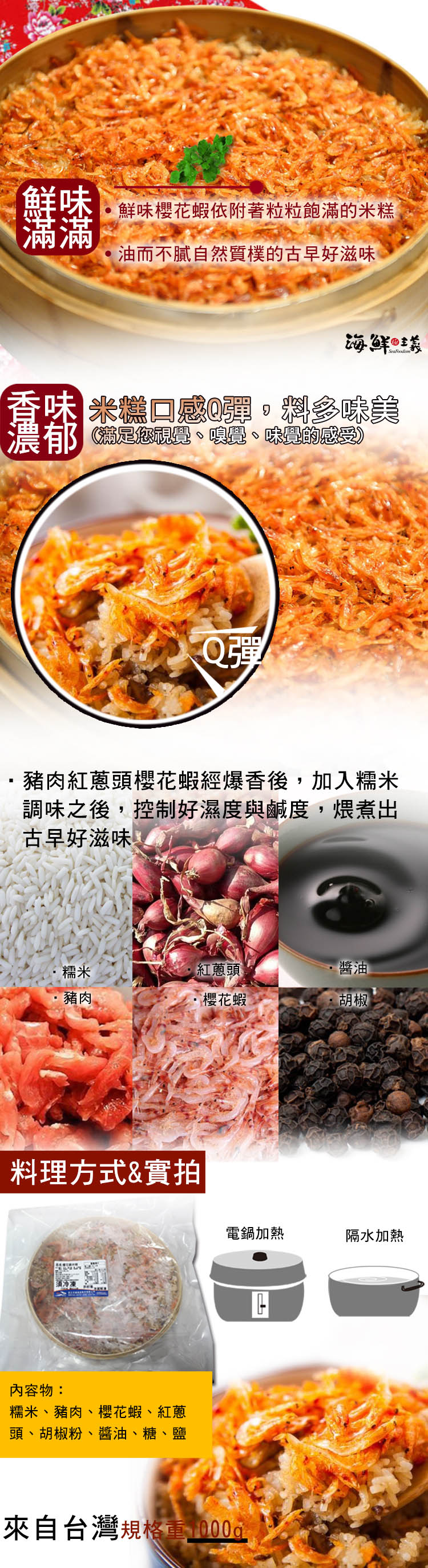 成分:糯米、絞肉、櫻花蝦、糖、紅蔥頭、醬油、胡椒粉、蒜頭酥、桔餅、鹽
